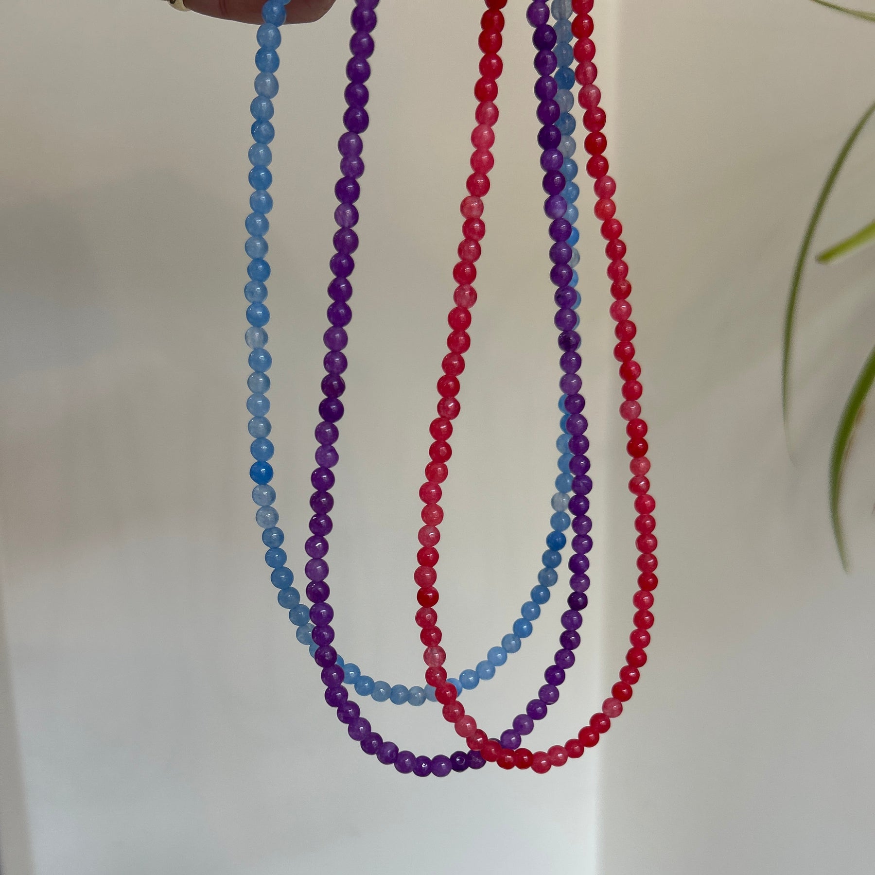 Hand crafted in our Corbridge workshop with purple dyed jade beads. This beaded necklace measures 16" with an adjustable gold plated or silver chain to length the necklace to 18".