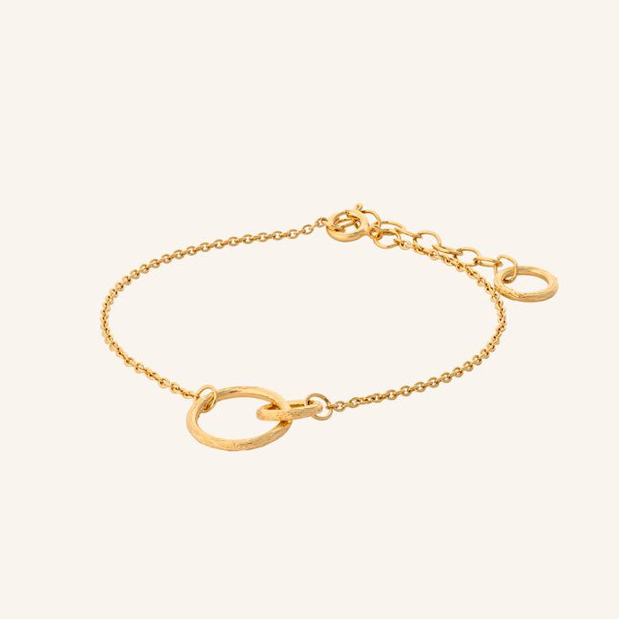 This stylish gold plated double circle bracelet is perfect for special occasions, featuring two delicate gold circles interlinked to form a beautiful piece of jewellery. Crafted from the certified recycled silver and with a gold plating and made with care, this bracelet is a timeless addition to any jewellery collection.