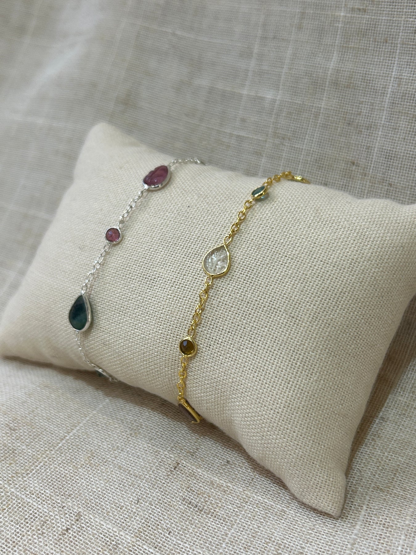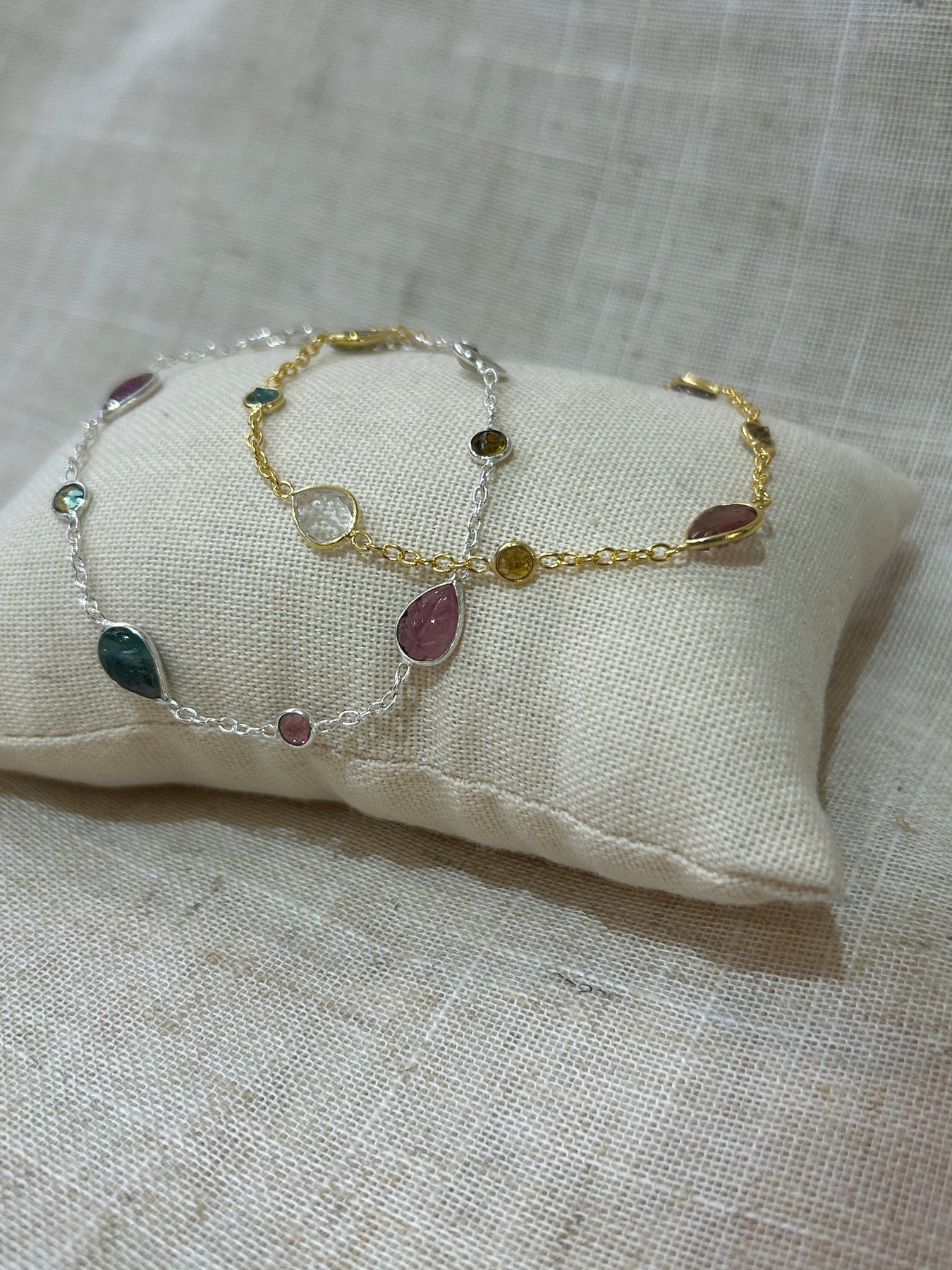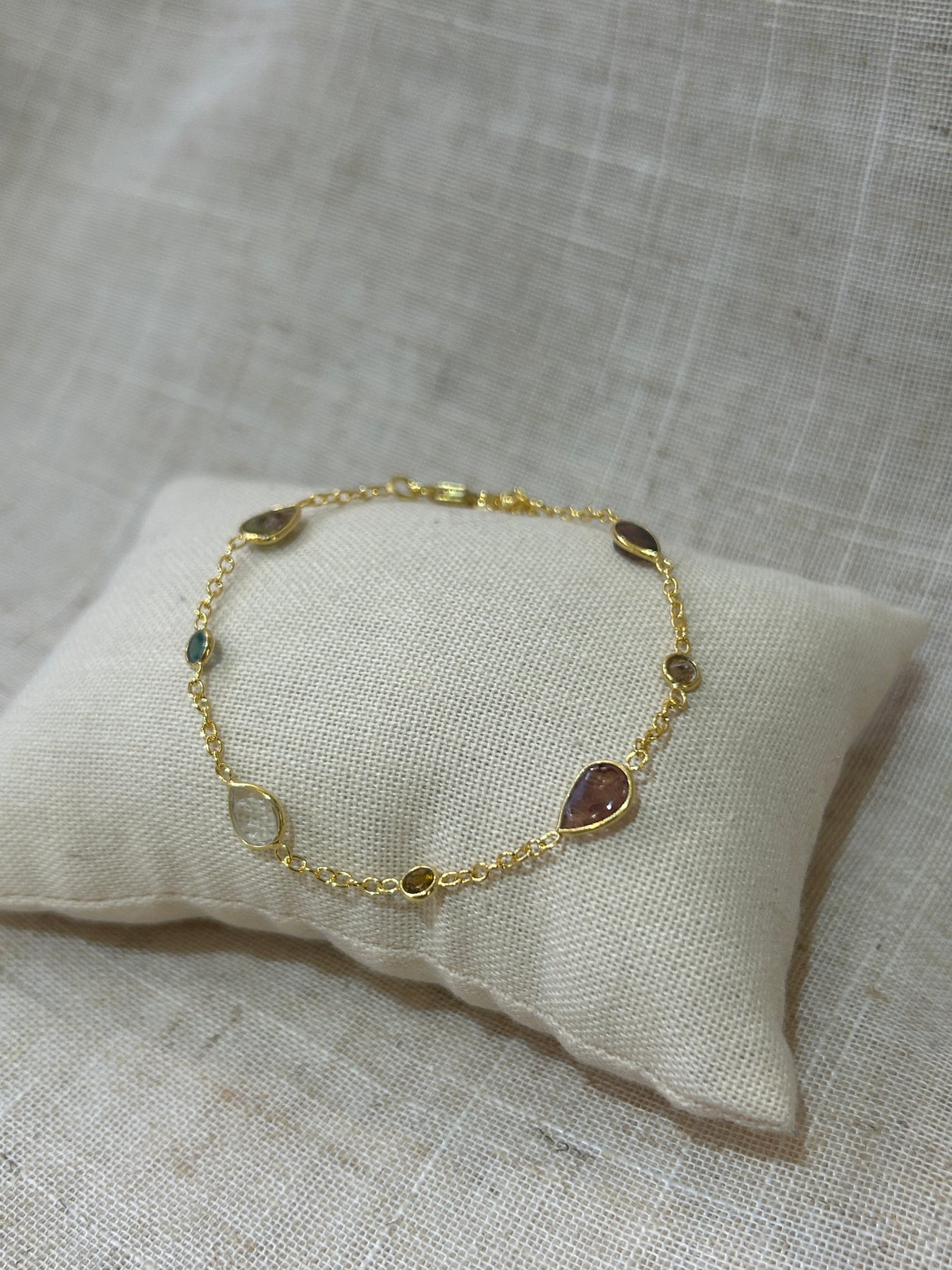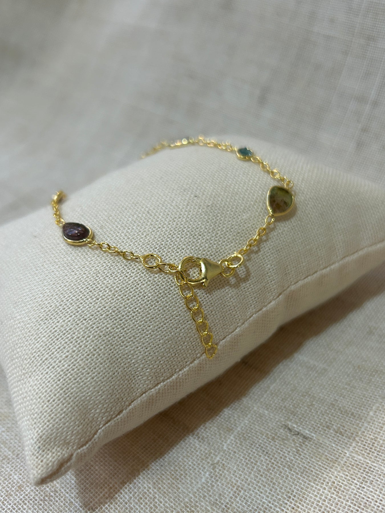 Natural round, oval and teardrop-shaped tourmaline gemstones are set in a sterling silver 18k gold plated setting interspersed along a delicate chain.
