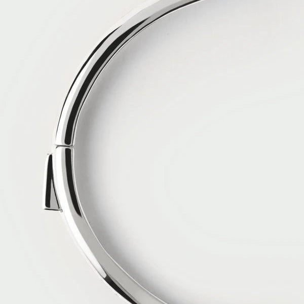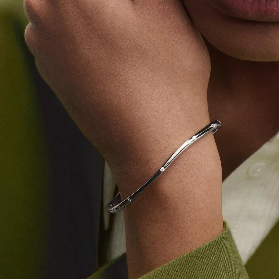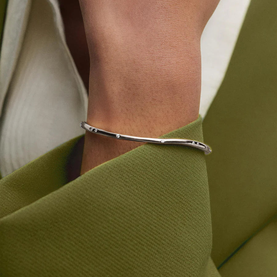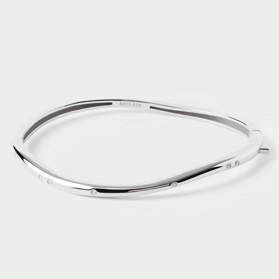 The PDPAOLA Air silver bangle features a sleek design characterised by fluid lines and adorned with sparkling zirconia. This bangle offers a modern aesthetic suitable for various occasions, enhancing any outfit while providing a durable and lightweight accessory option.