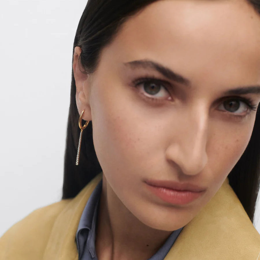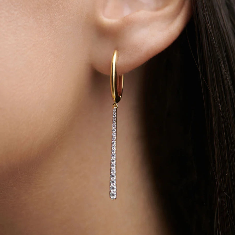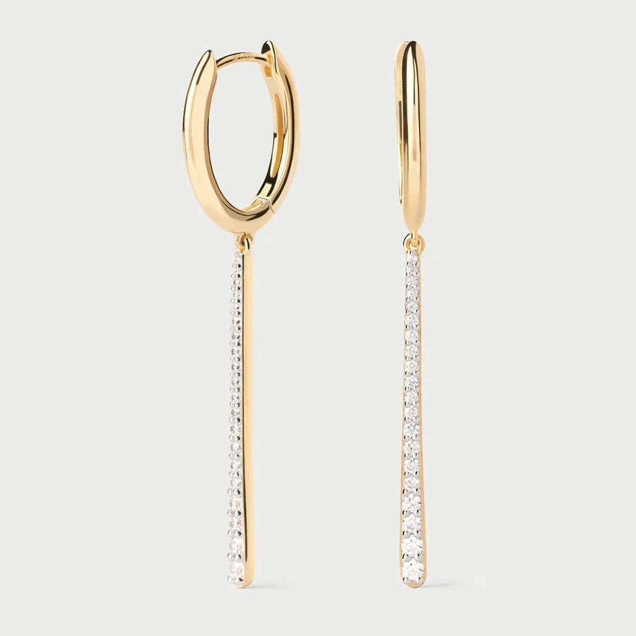 We are delighted to stock this stunning pair of hoop earrings with sparkling white cubic zirconia drops made by PDPAOLA. Made in 100% recycled sterling silver with 18ct yellow gold plating, these simple hoop earrings feature a long tapered bar studded with CZ stones.
