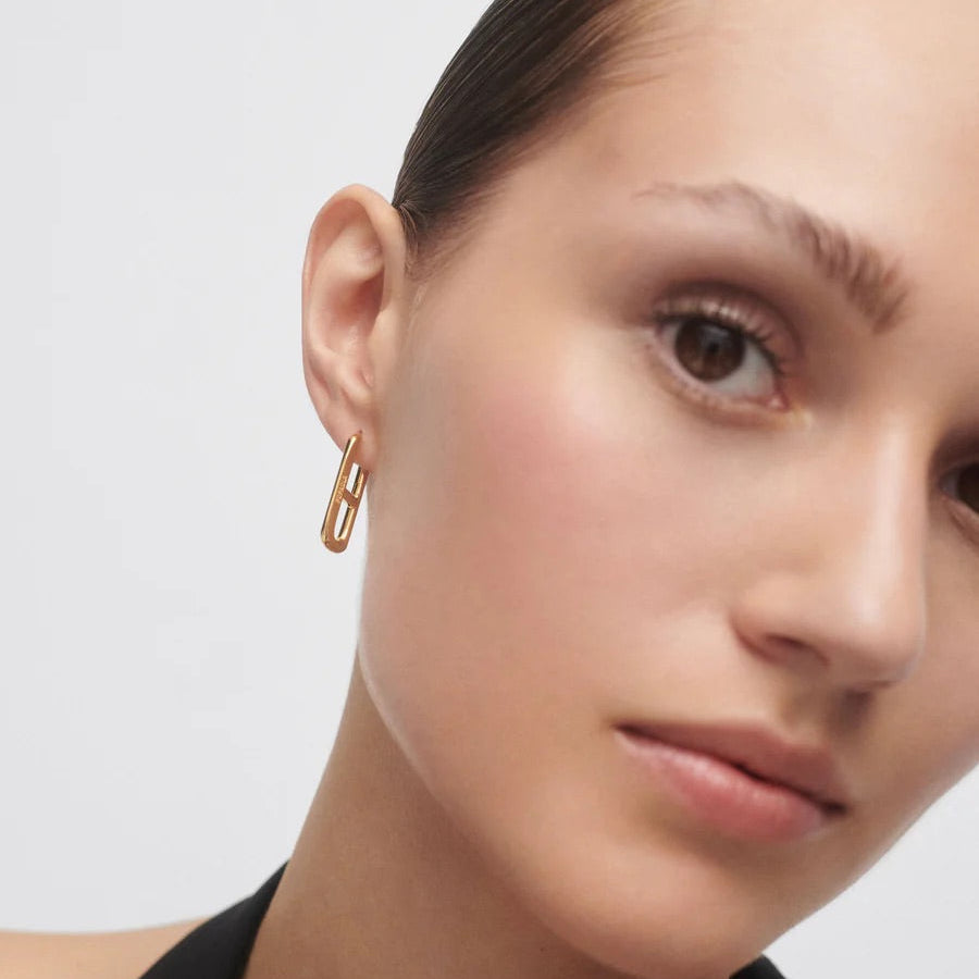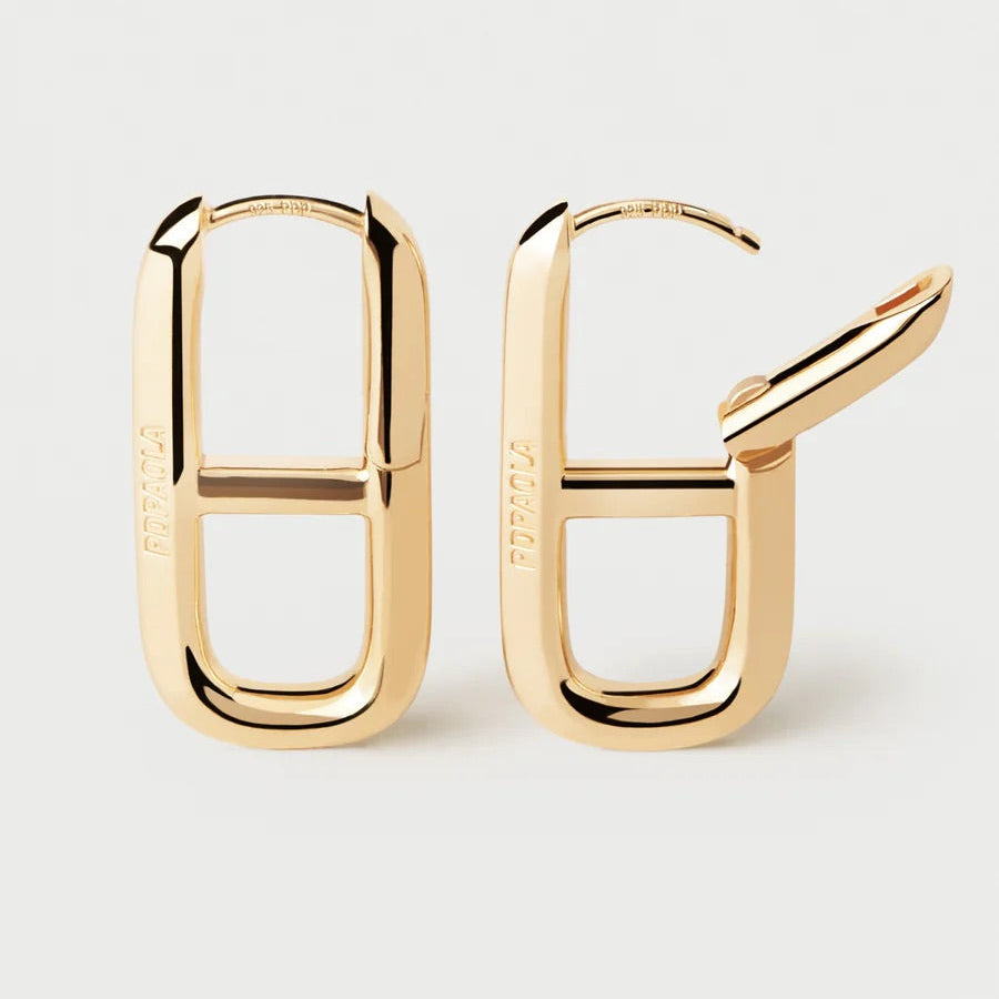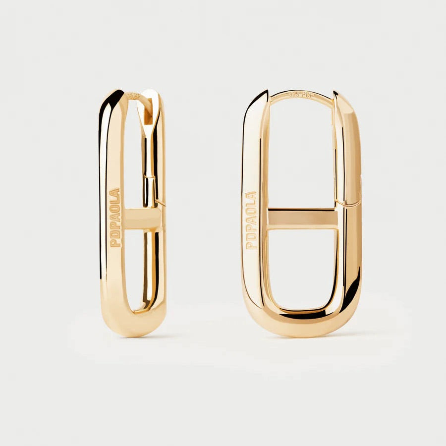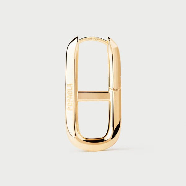 These striking geometric oval hoops showcase a bold horizontal crossbar design, crafted in lustrous gold plating for a contemporary edge. The clean lines and architectural silhouette make them a versatile statement piece—equally at home with minimalist styling or layered with other jewellery. PDPAOLA's signature modern aesthetic delivers understated luxury with wearable impact.
