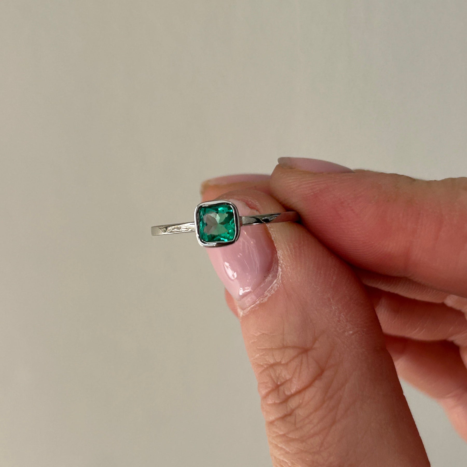 A vibrant cushion cut Emerald set into a platinum cushioned shaped bezel setting set into a fine platinum ring band. This Emerald is a stunning vibrant cushion cut stone measuring 6.1mm x 6.1mm and is 0.35ct. The ring band measures approximately 1.5mm.