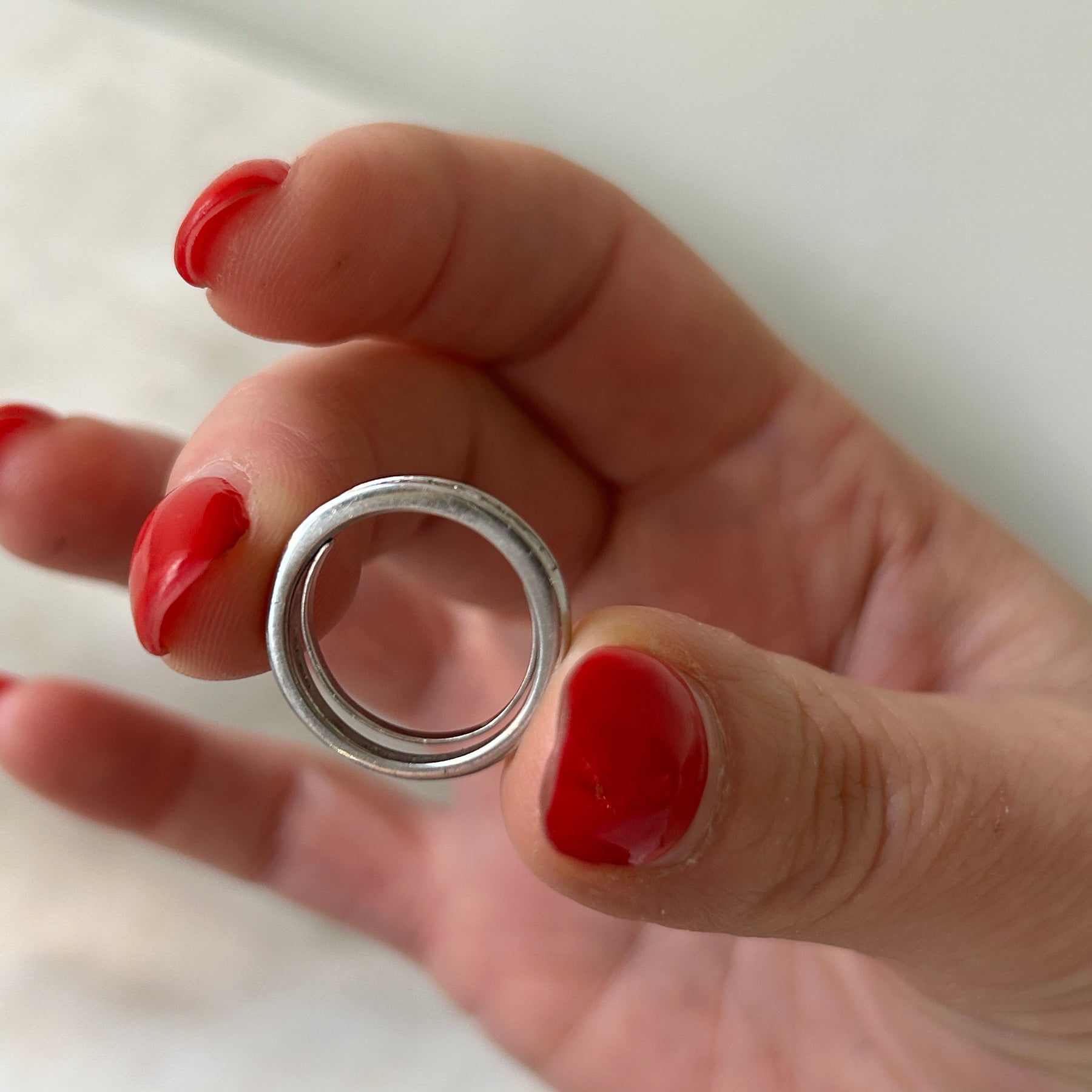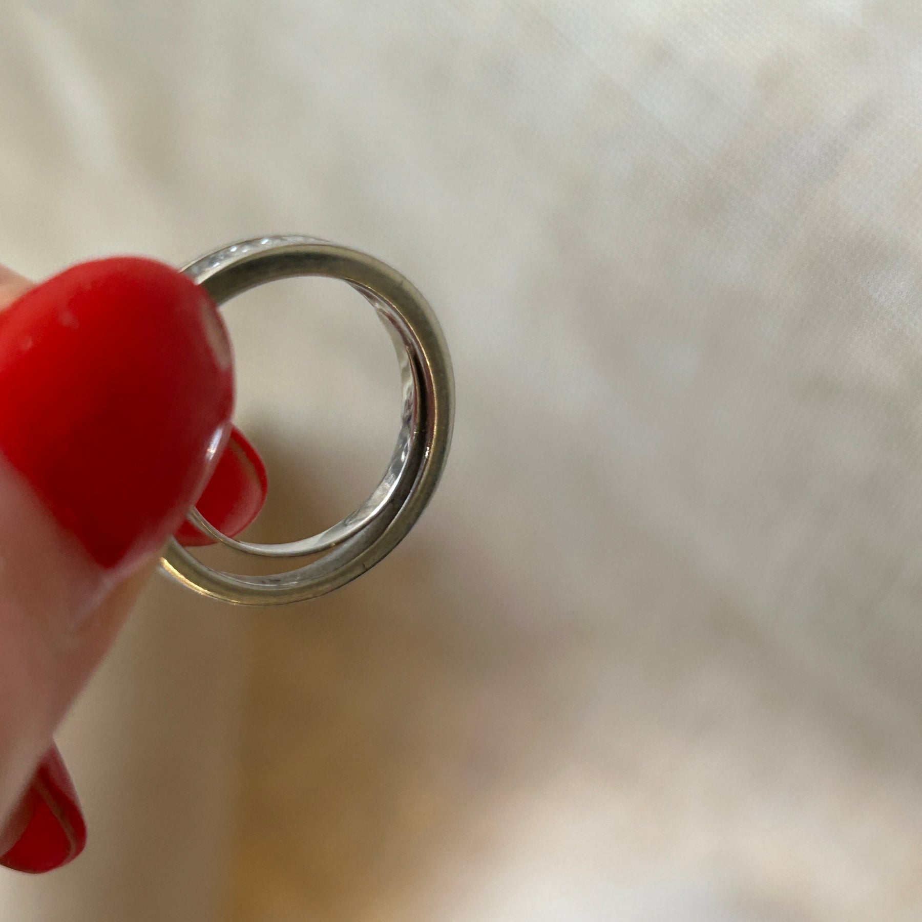 Platinum pre-loved ring held by hand with soft focus background
