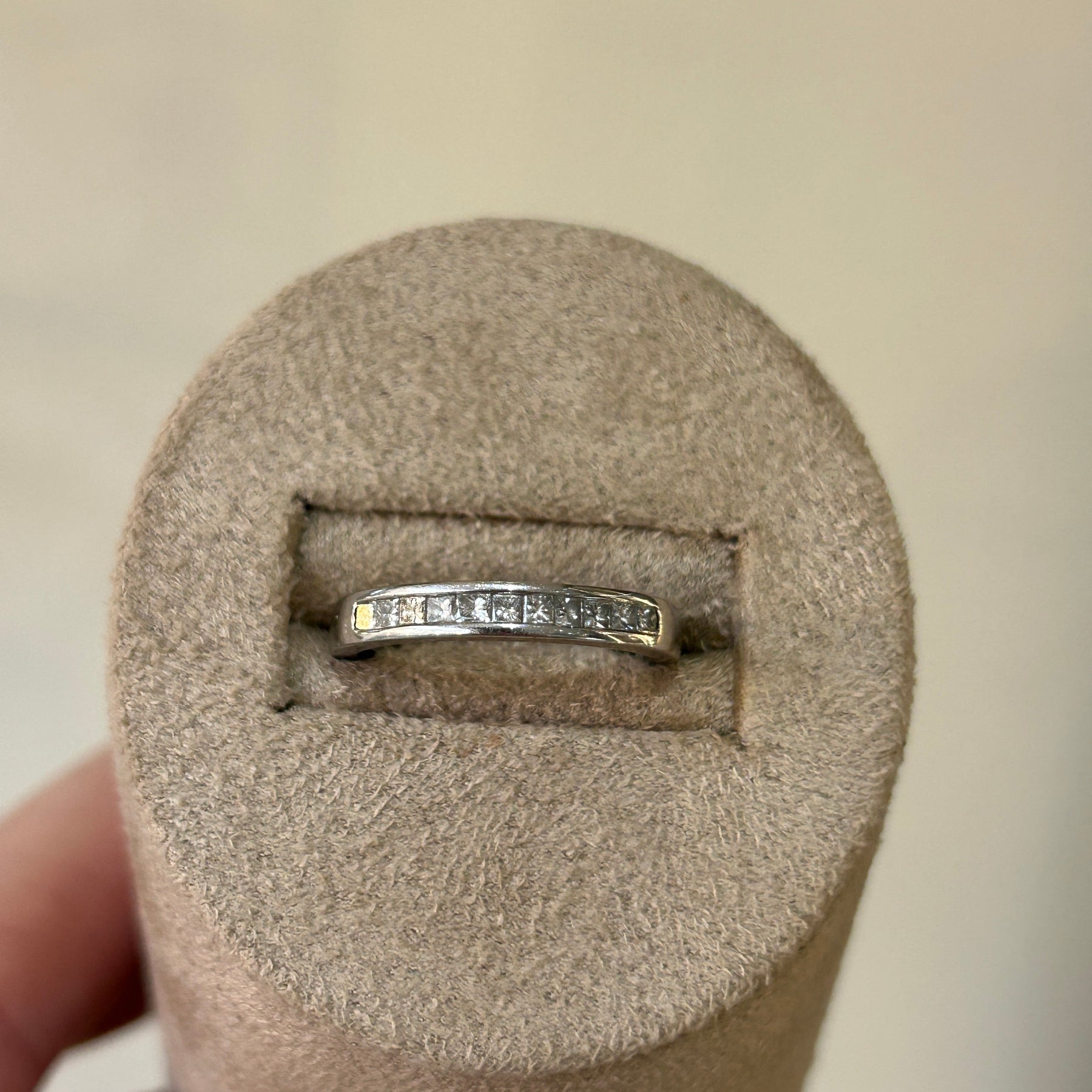 Platinum pre-loved eternity ring held by hand with soft focus background