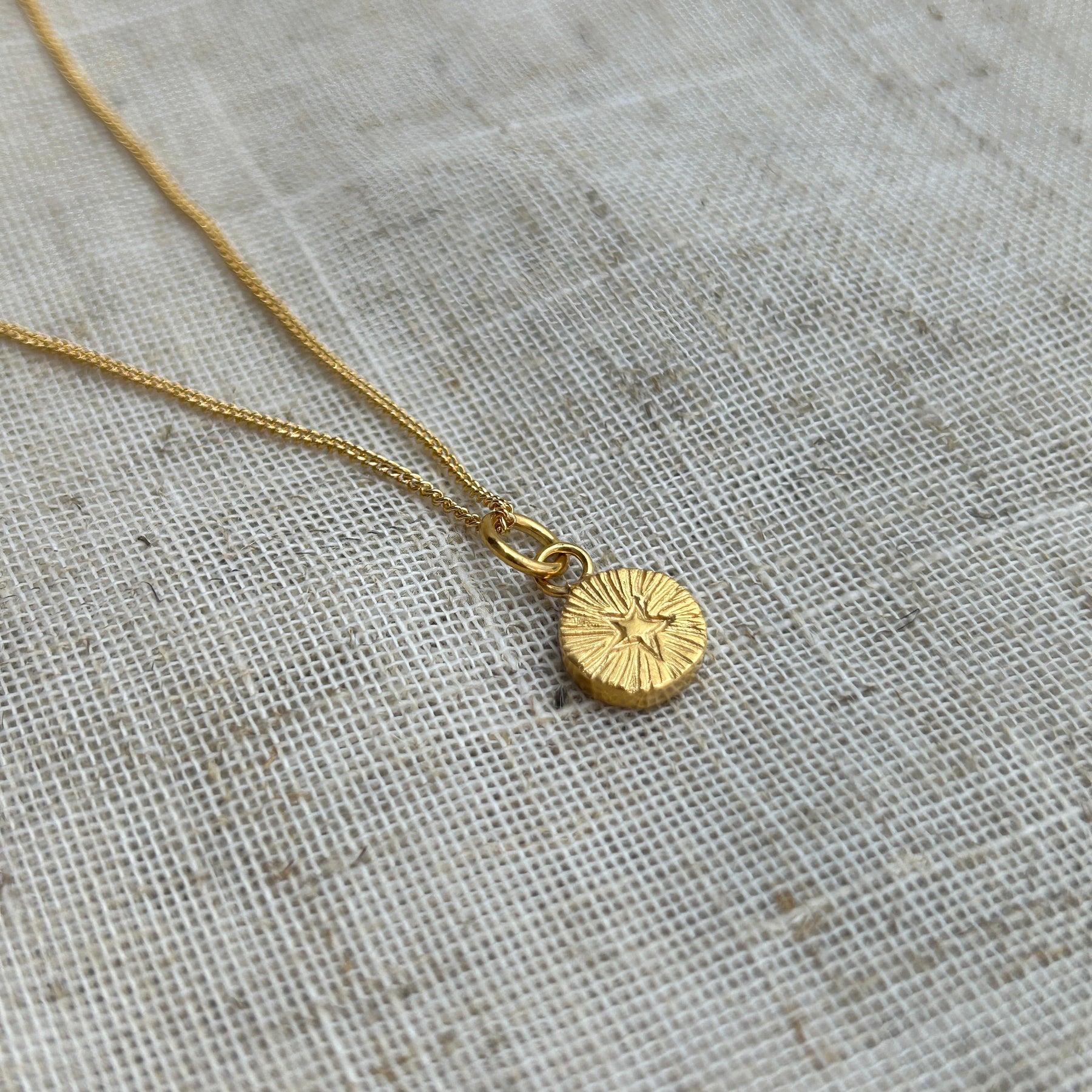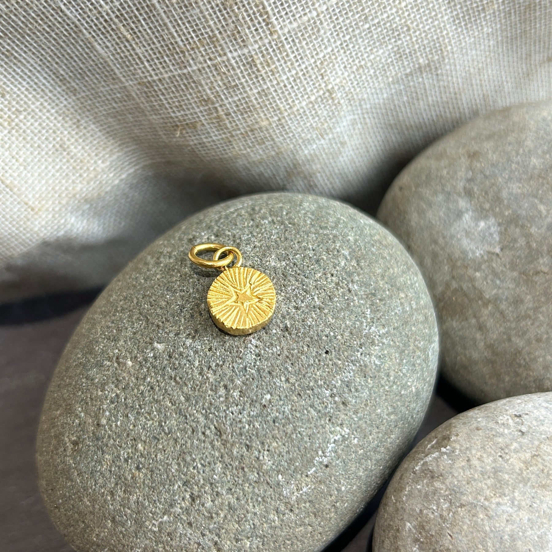 Gold charm with a textured design on a stone surface next to fabric.