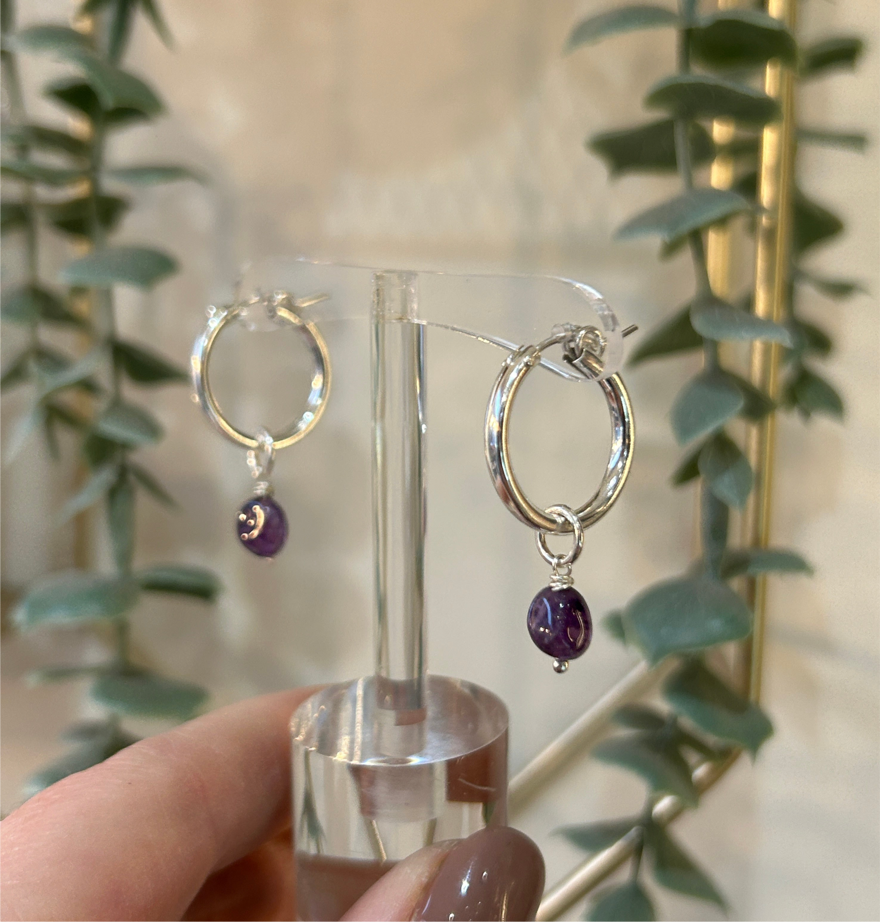 The 19mm diameter offers a statement-making silhouette, while amethyst gemstone charms add a touch of colour and natural beauty. Crafted in silver, they're versatile enough for everyday wear yet distinctive enough to elevate any occasion. A timeless piece that works beautifully with both casual and formal styling.