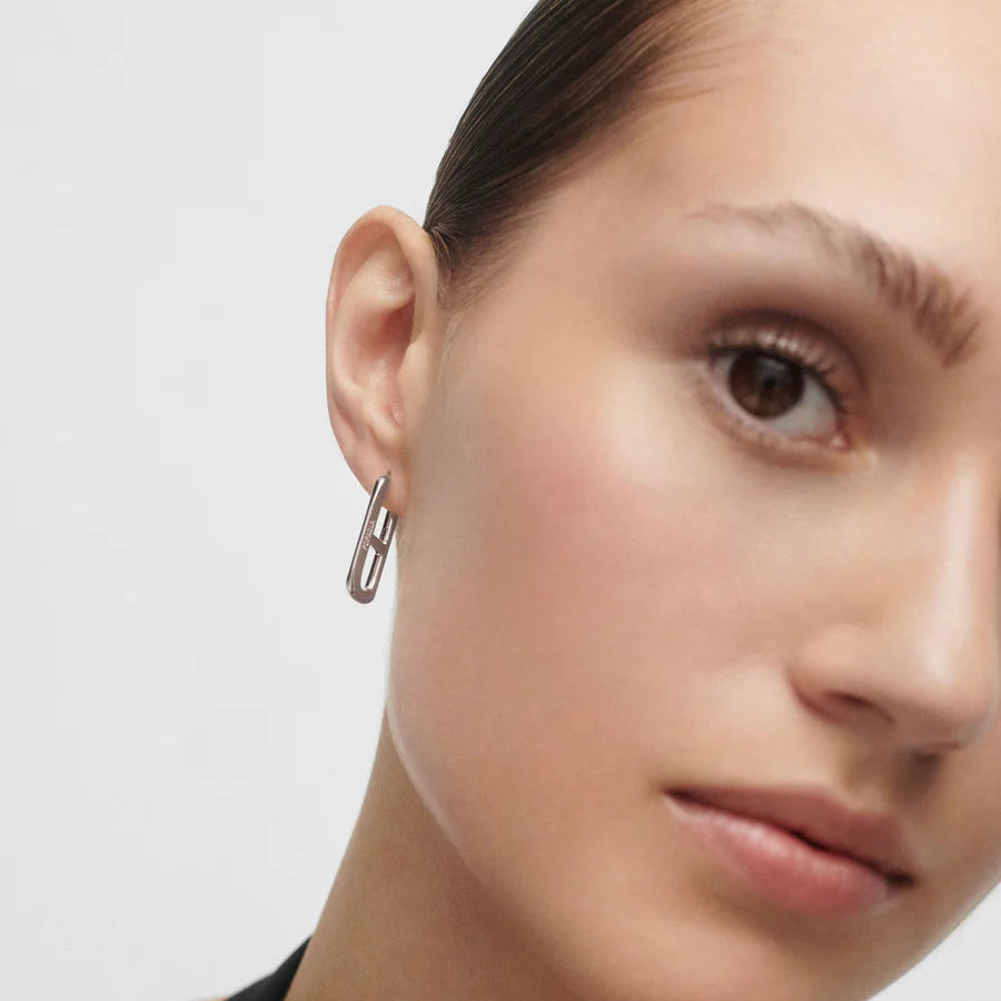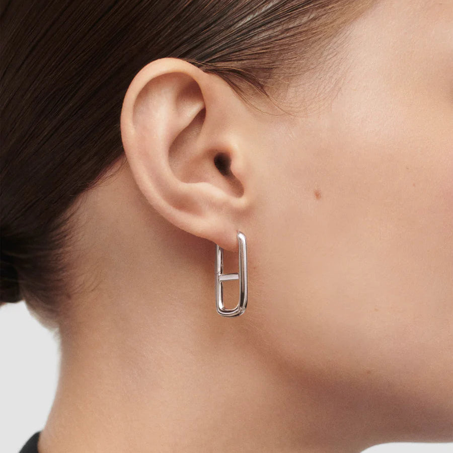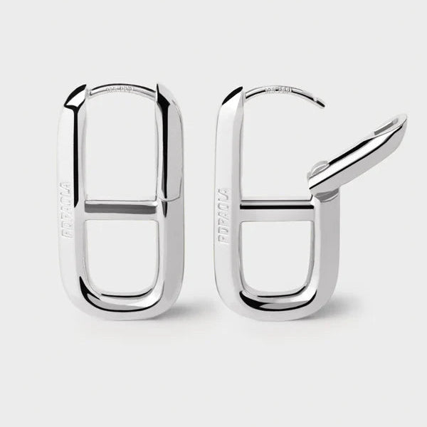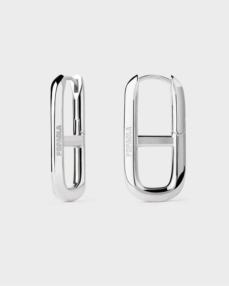 PDPAOLA Texas Silver Hoops combine contemporary geometry with timeless elegance. These striking oval hoops feature a distinctive horizontal crossbar that adds architectural interest and modern sophistication. Crafted in silver, they offer a refined statement piece that transitions effortlessly from day to evening wear. The geometric design brings dimension to any look whilst maintaining the understated luxury that defines PDPAOLA's aesthetic. Perfect for those who appreciate bold, thoughtfully designed jewellery with clean lines and lasting appeal.